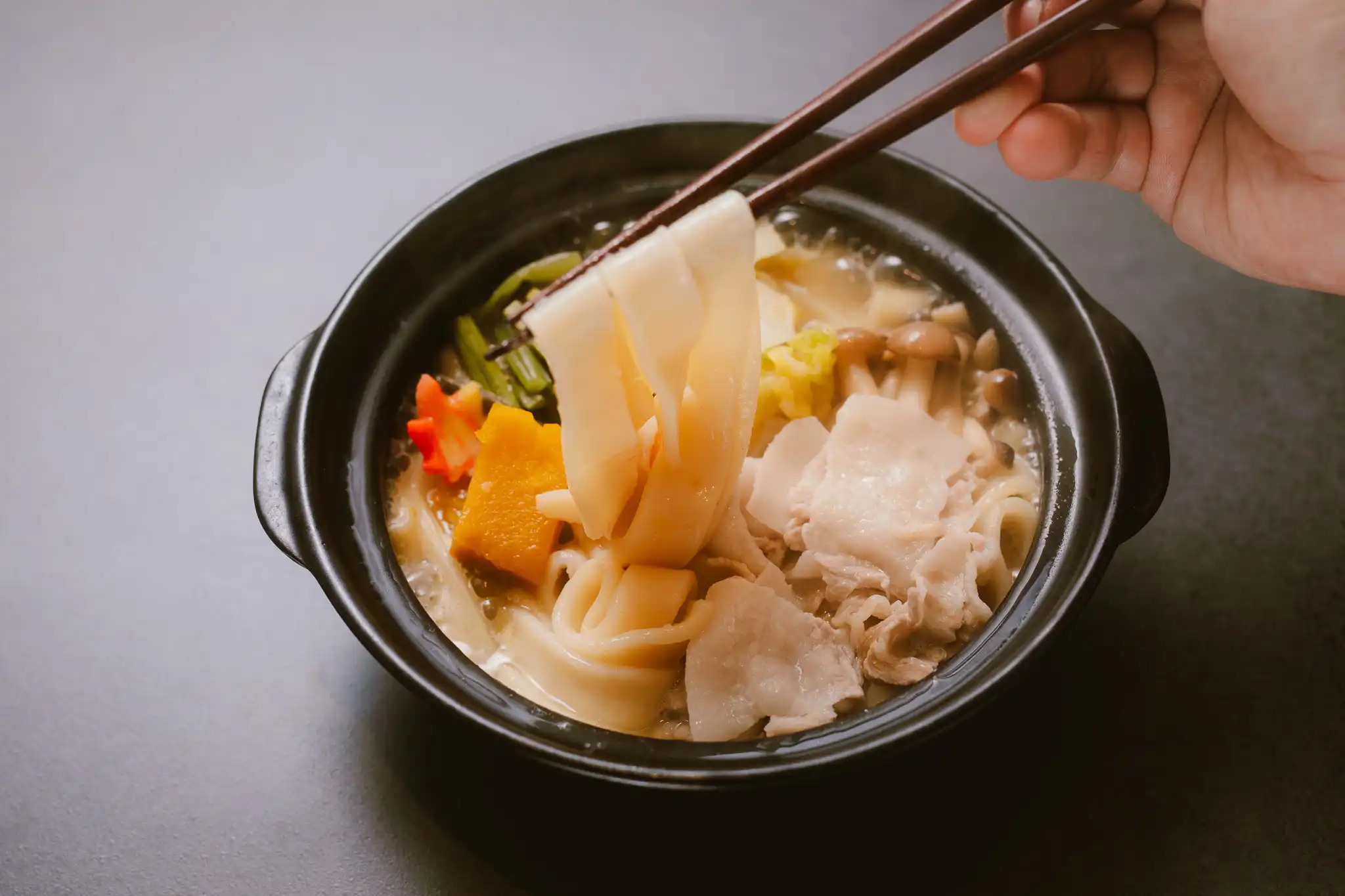 The rich miso soup with the sweetness of the gentle pumpkin melts and the flat noodles with melty softness are the deliciousness that gradually soaks into the body.
