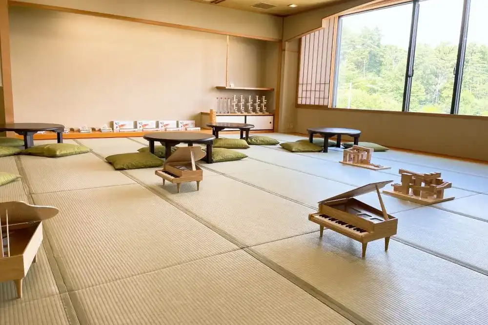 3층에 있는 숲의 라운지는 신발을 벗고 편안한 다다미가 깔린 화의 온기를 느끼는 공간으로, 창문 너머에는 맑은 날씨, 후지산을 바라보는 장대한 경치가 펼쳐집니다. 야쓰가타케 관련 서적을 약 4,000권 갖추고, 챠부다이와 쿠션으로 편히 쉬는 독서 스페이스나, 다양한 옛날 놀이를 할 수 있어 3세대의 가족으로 즐길 수 있는 아이템을 준비.