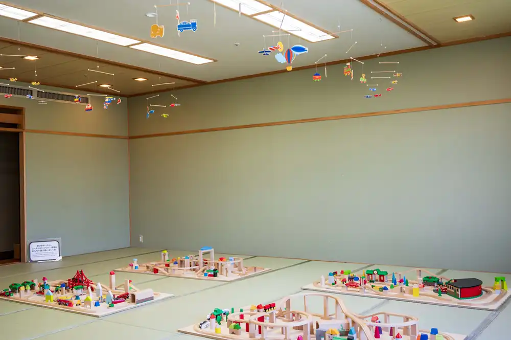 스웨덴제 목제 열차 장난감으로 만들어진 고정 코스와 스스로 조립하는 다양한 소재를 준비하고 있는 「트레인 룸」