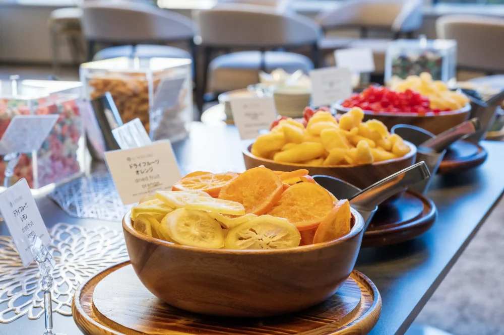 이그제큐티브 라운지의 Evening cap에서는 각종 스낵이나 드라이 과일, 하겐다츠의 아이스 3종 등의 food나 고집의 야마나시현산 와인, 야마나시현산 쌀 소주, 맥주를 제공하고 있습니다.