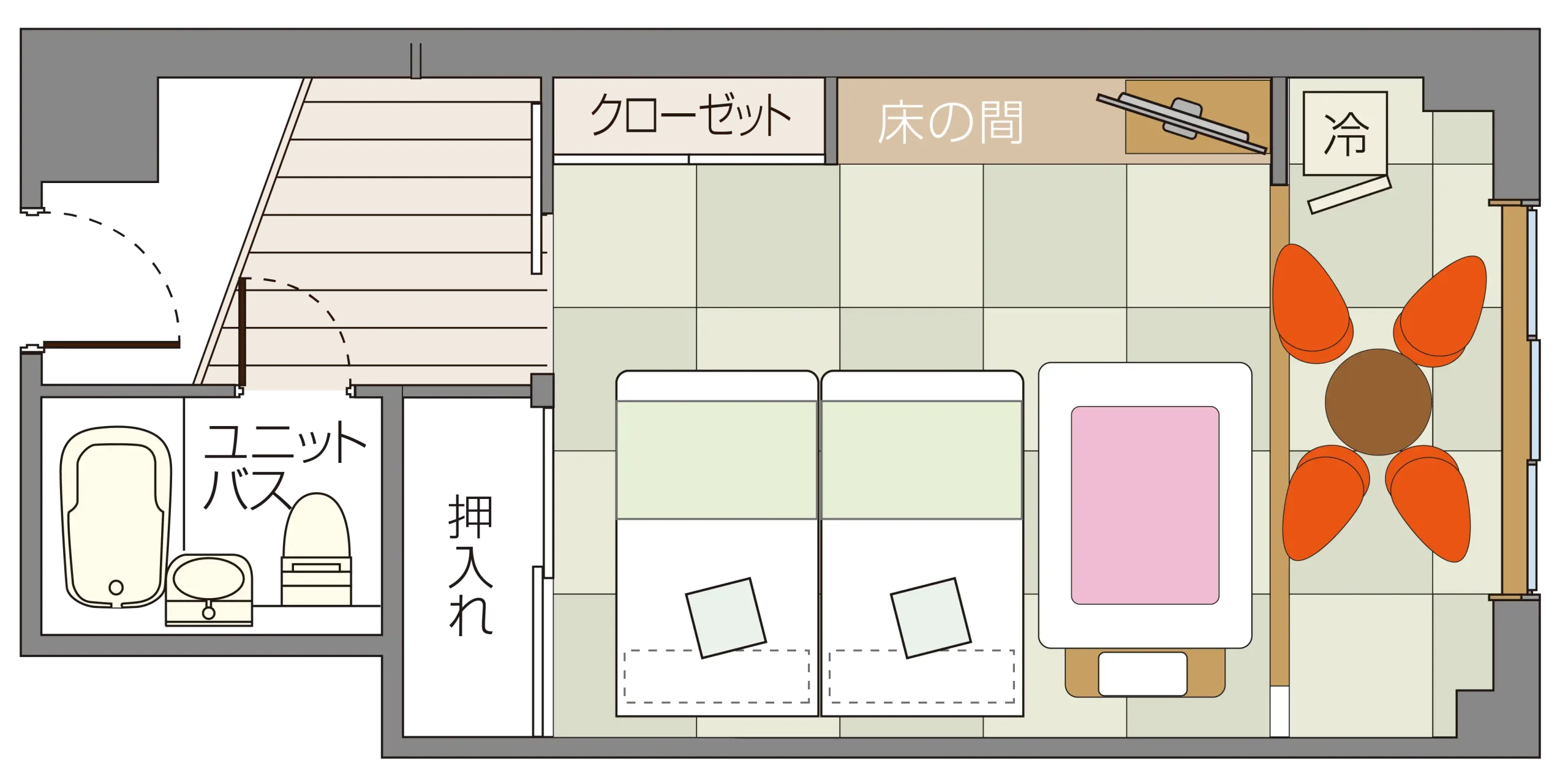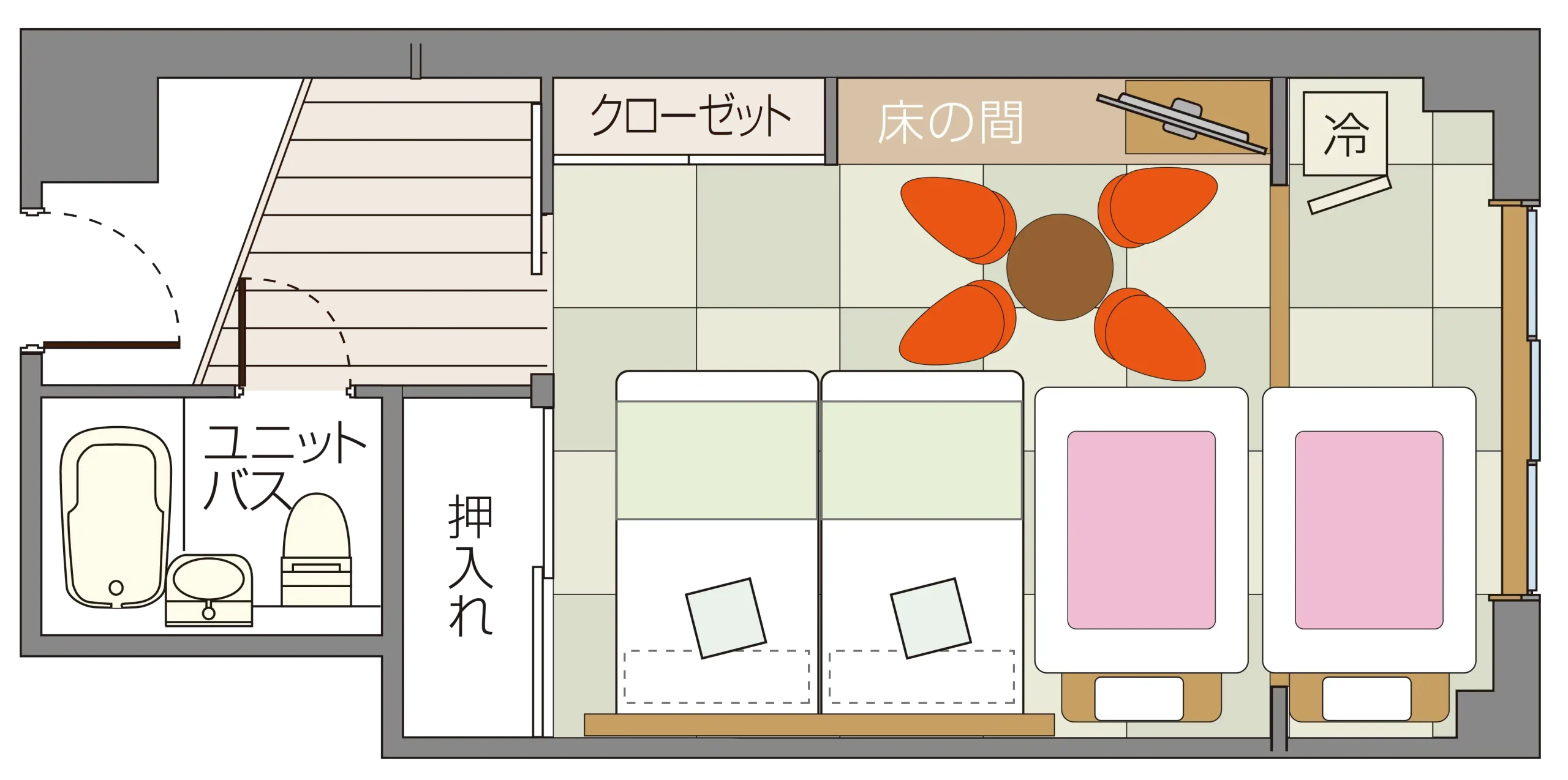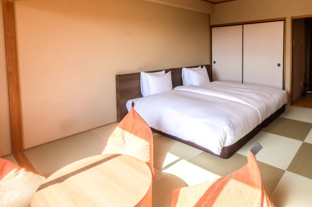 除了兩張床之外,還可以在榻榻米空間裡鋪上3組被子。最多可以住宿5人(+同床3人),所以和爺爺奶奶一起旅行,也可以在一個房間裡留下回憶。