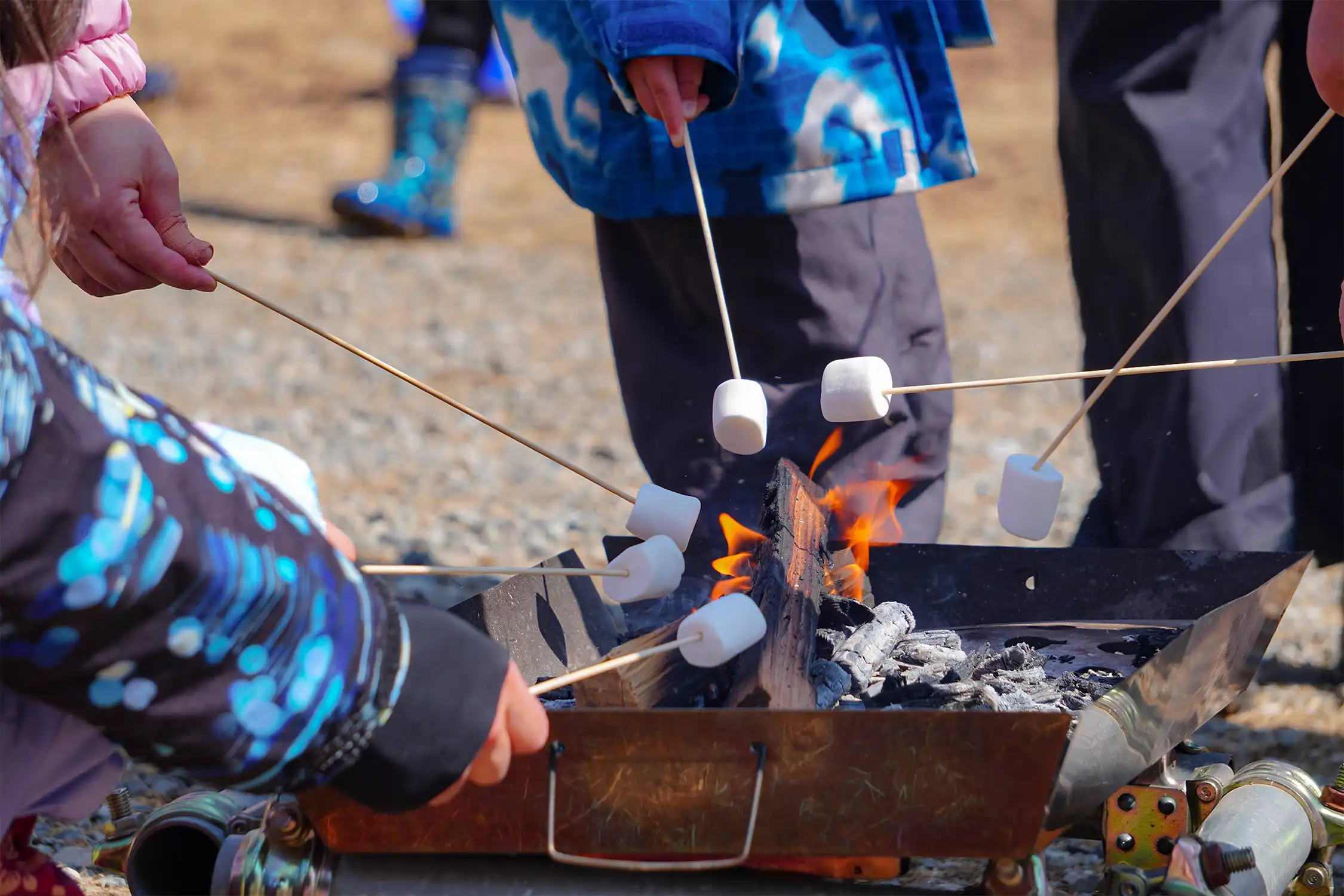 這個時期,篝火的樂趣之一是烤棉花糖。富士見高原滑雪場雖然是週末限定的,但是為了讓孩子們體驗烤棉花糖,每人贈送一根棉花糖串作為禮物。